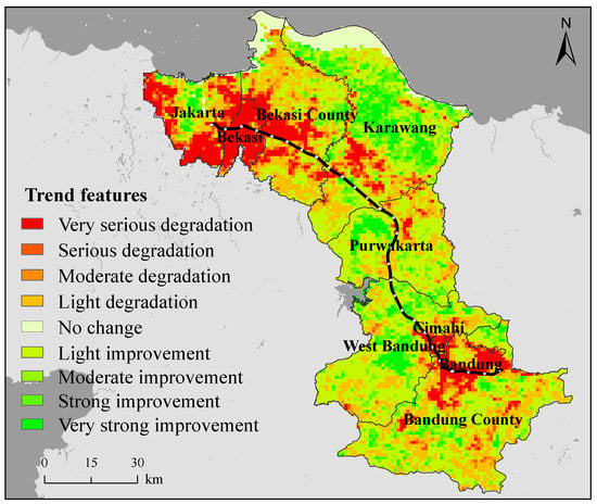 Figure 5 indicates that the spatial distribution of degraded areas mainly radiates from the central regions of each county, forming concentric circles. The degree of degradation is most severe in the central regions, gradually weakening as the distance from the center increases. The reason for this pattern is that the central regions of each city and county have experienced rapid urbanization over the past 20 years, leading to the conversion of agricultural and grassland areas into built-up land. Consequently, surface temperature has increased, vegetation coverage has decreased, aridity has intensified, humidity has decreased and the EEQ has continuously degraded. The regions with severe EEQ degradation are the most critical areas that require attention. These areas are mainly located in the suburbs of Jakarta and the suburbs of Bandung, Bekasi and Cimahi. To analyze the degradation types in these regions in detail, two typical cities (Jakarta and Bandung) within the study area were selected. The change trend maps of EEQ over the past 20 years at a 30 m resolution were plotted for these cities (Figure A1). In the EEQ trend maps at 30 m resolution, four severely degraded small areas were selected. Combined with the remote sensing images of these areas in 2000 and 2020 (Figure A2), it was observed that these regions experienced an occupation of green spaces by construction land over the past 20 years. This observation is consistent with previous studies [61].