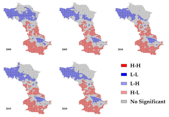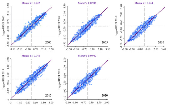 Using ArcGIS, grid cells of 1 km × 1 km were used as sampling units, and a total of 9439 grid points were extracted for each year. Subsequently, using GeoDa, Moran scatter plots (Figure 6) and LISA cluster maps (Figure 7) were generated.