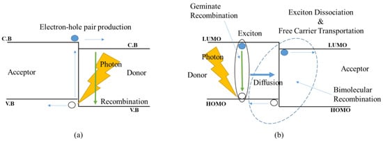 The process of photocurrent generation in (a) inorganic materials and (b) organic materials.