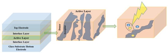In order to attain the exceptional device performance of the BHJ structure, the absorption efficiency of the active layer, particularly the film thickness, must be enhanced. Most of the organic semi-conductors have low charge mobility, and for efficient charge transportation and collection, the typical thickness of the active layer is about 100 nm. Based on the Beer–Lambert law, as shown in Equation (1) [37], the absorption response is in a direct relationship with film thickness.