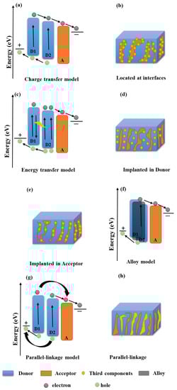 The materials used in the BHJ structure were categorized based on their structure, including polymers, small molecules, nanostructures, and dyes. Therefore, selecting the third component in a ternary system induces more convolution in the charge transport mechanism, whereas the contribution of the third component enhances all of the absorption profiles, exciton dissociation, charge transport, and film morphology. The literature shows that the mechanism of charge transport in ternary systems involves four main operative mechanisms [21,25,27,44]. The transport mechanism involves the energy levels and band gaps of the three components, entitled charge transfer and energy transfer mechanisms, whereas parallel alloy models, rely on the nanomorphology of the active layer. Due to the placement of the inserted components in the ternary active layer, it is remarkable that in some systems, more than one mechanism may exist simultaneously [21,27]. Thus, the location of the third component has a decisive role in defining the transport mechanism of charge carriers, as shown in Figure 3.