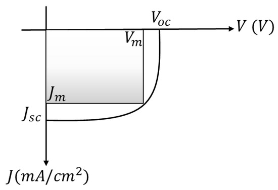 where and represent the maximum value of voltage and current delivered to the external load. FF is the fill factor, which designates the relationship between the collection and recombination of the free charge carriers. is the power conversion efficiency , is the maximum output power of the cell, and is the incident light input power [9,56].