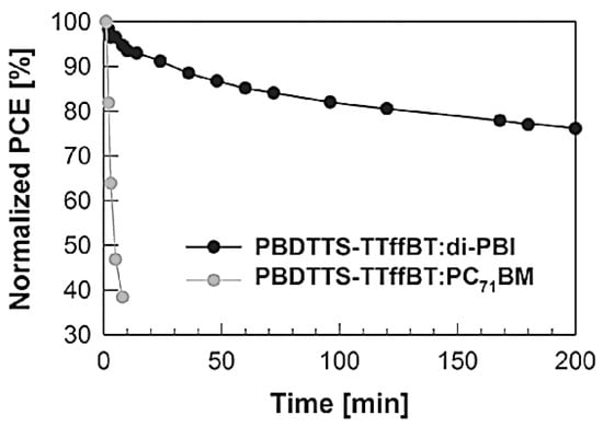In addition, the delayed aggregation at high temperature of the non-fullerene acceptors, when compared to that of the fullerene materials, significantly adds to an improvement in stability. Lee and Jung reported a comparison of the fullerene and non-fullerene acceptors employed in a binary BHJ structure [85]. Figure 6 shows that the bay-linked PBI derivative (di-PBI) has interestingly enhanced device stability, and 30% of the initial efficiency decreased after 3 h of operation at 100 °C. Nevertheless, the use of fullerene acceptor has led to a sharp drop in efficiency [85].