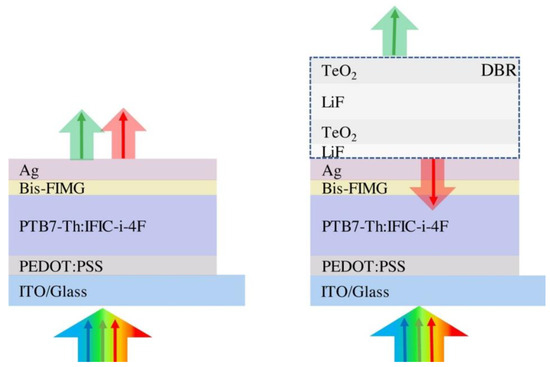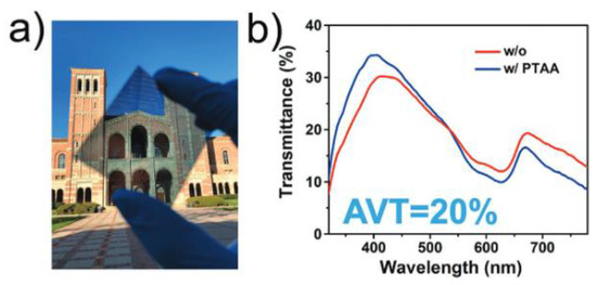 On the other hand, the weight ratio adjustment of the components of the photoactive layer was used for enhancing semi-transparent solar cells. Hu and co-workers employed a narrow band gap material as a host binary material and investigated the effect of the weight ratio of the third component. In addition, IEICO-4f, as an ultra-narrow gap, forms an alloy with the host acceptor material due to similar electronic energy (HOMO and LUMO) levels [89], and the optimum weight ratio was found to be 50%. Moreover, Wang et al. balanced the trade-off between PCE and AVT upon inserting (10 wt%) of the BTTPC acceptor into the host binary blend. Because of the enhancement of the rate of hole transport, the charge recombination was reduced in the ternary blend. Additionally, further improvement was observed for AVT without affecting the PCE due to the application of a photonic reflector, as shown in Figure 10 [94].