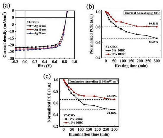 In addition, reducing the thickness of the active layer is another approach for converting an opaque structure into a semi-transparent structure. For instance, Lu et al. utilized a small molecule from DIBC as a third component in a binary PM6:Y6 host system. The stability and thickness tolerance of the active layer was demonstrated, as shown in Figure 9. The ST-OSC was exposed to continuous irradiation and thermal annealing. The device with 10% DIBC kept around 80% of its original efficiency after annealing for 300 min at 60 °C. Similarly, after 300 min of illumination, the device lost its efficiency by 33%. It was found that due to hydrogen intermolecular bonds, the aggregation of photo-sensitive materials can be enhanced. Therefore, extra channels for charge transport are facilitated because of the presence of more contact interfaces. Consequently, the incorporation of a small portion of the hydrogen bond via inserting DIBC hinders both bimolecular recombination and trap-assisted recombination [88].