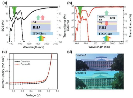 External quantum efficiency (a) and transmittance spectra (b) of device A and device B, respectively (the green dashed line represents human photonic response at 555 nm); (c) J−V characteristic curve and (d) a photograph representing their see—through nature. Reprinted from [94].