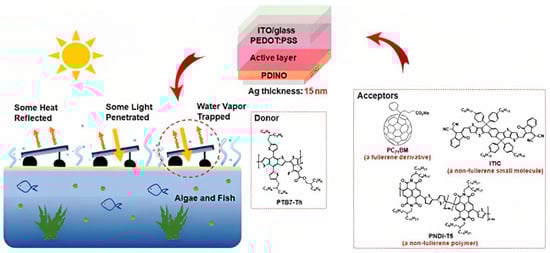 - Zhang, N.; Chen, G.; Xu, Y.; Xu, X.; Yu, L. Power Generation, Evaporation Mitigation, and Thermal Insulation of Semitransparent Polymer Solar Cells: A Potential for Floating Photovoltaic Applications. ACS Appl. Energy Mater. 2019, 2, 6060–6070. [Google Scholar] [CrossRef]