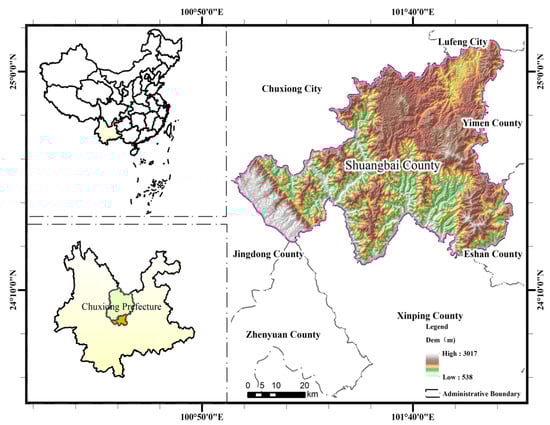 Shuangbai County, nestled within the core of Central Yunnan Province, borders the Miaolun Mountains to the east and the watershed of the Jinsha River and Red River system to the south. It falls under the jurisdiction of the Chuxiong Autonomous Prefecture of Yunnan Province and serves as a confluence for the cities of Chuxiong, Yuxi, and Pu’er. The geographical coordinates for the county extend from 101°03′ E to 102°02′ E, and 24°13′ N to 24°55′ N (Figure 1). The area is characterized by a northern subtropical-highland monsoon climate, marked by its hot and rainy periods and a clear distinction between wet and dry seasons. All river systems within Shuangbai County are part of the Lishe River region in the upper portion of the Red River Basin. This network includes 35 large and small streams and rivers, with the more significant tributaries being the Malong, Lushui, and Shadian Rivers. Positioned on the western edge of Yunnan’s “mountain” front arc and the central segment of the Qinghai, Tibet, Yunnan, and Myanmar “outlaw” tectonic structures, the county covers part of the Nanhua–Chuxiong–Qujiang Fault. These challenging geological conditions contribute to a vulnerable geological environment prone to a myriad of geological disasters. The study and understanding of these dynamics hold considerable theoretical value and practical relevance for local disaster prevention and mitigation efforts.