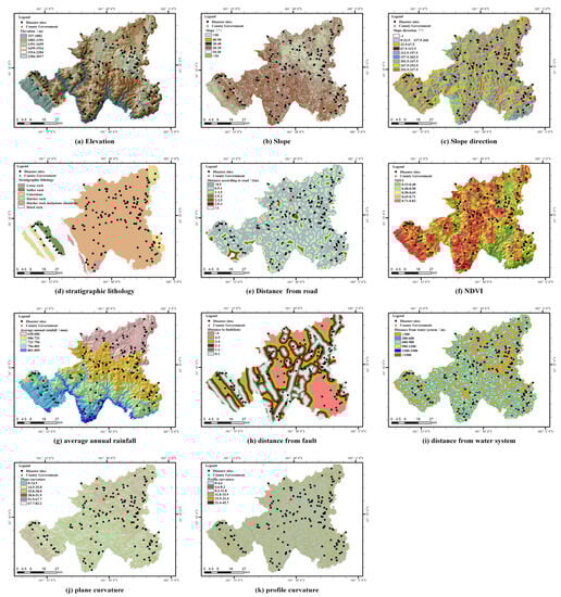 The DEM and NDVI data are openly available in [the geospatial data cloud platform] at [https://www.gscloud.cn/], accessed on 11 April 2023. Geological hazard point data and 1:200,000 geological maps are openly available from [the Geographic Remote Sensing Ecology Network platform] at [http://www.gisrs.cn/], accessed on 11 April 2023. Water system and road data can be obtained from [the National Catalogue Service for Geographic Information] at [https://www.webmap.cn/], accessed on 11 April 2023.