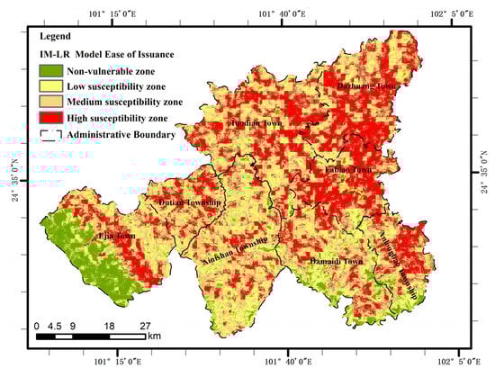 The variables – represent the information values associated with slope direction, NDVI, distance from the water system, plane curvature, profile curvature, stratigraphic lithology, distance from the road, slope, distance from the fault, elevation, and average annual rainfall, respectively. Using the natural intermittent point method in ArcGIS, these variables are categorized into four grades: less-prone area, low-prone area, medium-prone area, and high-prone area, as depicted in Figure 5. This classification enables the creation of a landslide susceptibility zoning map based on the IM–LR model. The distribution of these areas is as follows: not-likely-to-occur area (9.44%), low-susceptible area (22.00%), medium-susceptible area (36.52%), and high-susceptible area (32.03%). The high-susceptible area is primarily concentrated in the central part of Ejia Township, the eastern part of Anlongbao Township, Fabiao Township, the southern part of Dazhuang Township, and Toudian Township. Conversely, the not-likely-to-occur area and low-susceptible area are concentrated in the western part of Ejia Township, the southern part of Anlongbao Township, Dutian Township, and the southern part of Damaidi Township. Moreover, the town is situated to the west of Ejia Township, the south of Anlongbao Township, the south of Dutian Township, and the south of Damadian Township. From the regression coefficients, it can be observed that the importance of each influencing factor on landslides in the study area is in descending order: distance to fault, distance from water system, NDVI, slope, elevation, distance from road, slope direction, plane curvature, profile curvature, stratigraphic lithology, average annual rainfall.