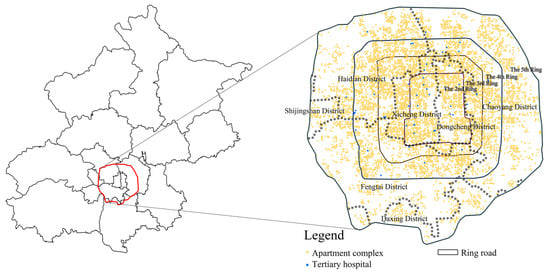 As the capital city of China and its political and economic center, Beijing is an important city for public transportation research because of its high population density and the high traffic load it generates. The scope map of this study is within the 5th Ring Road of Beijing (Figure 1). This area includes seven administrative districts: Dongcheng District, Xicheng District, Fengtai District, Daxing District, Chaoyang District, Haidian District, and Shijingshan District. Among them, there are 9679 valid apartment complex data points and 59 tertiary hospital data points. Most of the residential communities and tertiary hospitals are concentrated within the 4th Ring Road, and the number of apartment complexes and tertiary hospitals in the city center is more densely populated than in the periphery of the city.