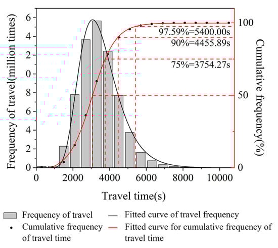 In the process of calculating the accessibility of tertiary hospitals, the time thresholds for different levels of hospitals often have different criteria, and the appropriate time thresholds for different levels of hospitals also vary from city to city. While in the study of hospital accessibility in Beijing, Rui [] and Lu [] concluded that the appropriate time threshold for accessibility of tertiary hospitals in Beijing is 5400 s. Travel times to all tertiary hospitals using apartment complexes are plotted in Figure 2: 5400 s corresponds to 97.59% of the cumulative travel frequency. Therefore, is chosen as the public transportation travel time threshold.