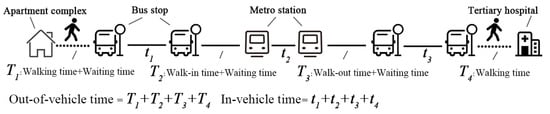 The world has shown a positive attitude towards public transportation. In developed countries, “creating conditions for public transport to become a high-quality alternative to personal transport” has been proposed [], while the development of public transport systems has been promoted in some countries []. Different policies have been introduced in developing countries for the development of public transport [,]. Among them, the Chinese government has developed strategies to ensure the sustainable operation of public transport systems []. Although domestic and international policies have been advocating the development of public transportation and encouraging the priority of public transit, there is still a lack of strategies to explore the current problems of public transportation system operation from the perspective of the actual process of public transportation operation. In other words, it is essential to focus on the impact of out-of-vehicle time on overall travel in public transportation.