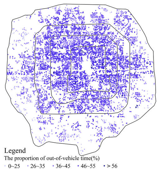 Out-of-vehicle time was counted, and the average out-of-vehicle time as a percentage of total travel time was calculated for all tertiary hospitals in the residential area (Figure 4). Most out-of-vehicle time in the 4th to 5th ring area is less than 25%, and the out-of-vehicle time within the 4th ring is higher. The average out-of-vehicle time is lower in the west and south of the study area between the 4th and 5th Ring Roads. Additionally, the result shows a phenomenon that the closer to the city center, the higher the average out-of-vehicle time share.