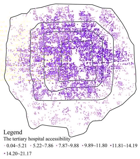 For the objectives of future studies, we provide the following recommendations: the supply points of the study population can be extended from tertiary hospitals to all levels of hospitals, i.e., tertiary, secondary, primary, and community hospitals. The mode of travel can be extended from the mode of public transportation travel to multi-modal transportation, i.e., the mode of cabs and public transport. While exploring the process of public transport interchange, the impact of walking time from the apartment complex to the waiting point and waiting time at the waiting point on the accessibility of medical treatment can be analyzed in the process of using cabs for medical treatment. The mode of travel can be extended from the mode of public transportation travel to multi-modal transportation, i.e., the mode of cabs and public transport. While exploring the process of public transport interchange, the impact of walking time from the apartment complex to the waiting point and the waiting time at the waiting point on the accessibility of medical treatment can be analyzed in the process of using cabs for medical treatment. At the same time, the selection of hospitals by different populations in the process of seeking medical treatment was not mentioned in this study, and subsequent studies should collect data on the corresponding populations and the superior departments of the relevant hospitals for different populations in order to improve the accuracy of accessibility in the process of seeking medical treatment. Finally, the algorithm is expected to calculate the appropriate out-of-vehicle time reduction scenarios for different ring zones, administrative divisions, and apartment complexes. Further studies should develop a dynamic out-of-vehicle time reduction scenario at the apartment complex scale and construct a decision model that provides highly accurate, real-time updates of optimal solutions for accessibility and equity of medical facilities.
