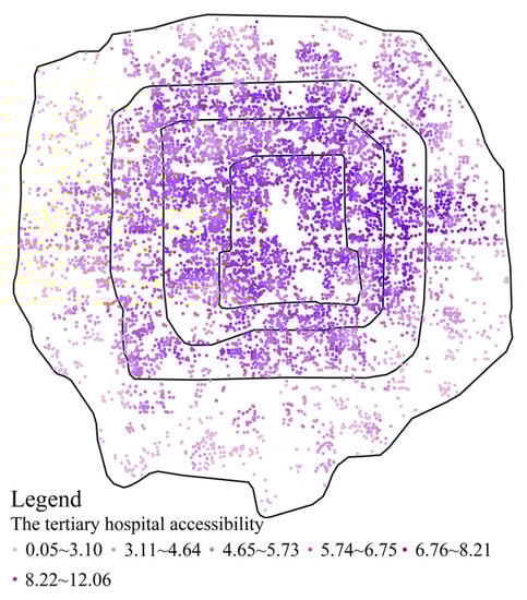 In the second step, a public transport travel time threshold is given for the apartment complex during the weekday morning peak hours so that the scope of each apartment complex is formed. The supply–demand ratio of tertiary hospitals falling within the size of the cell is summed up using the Gaussian equation with weights to obtain the accessibility of tertiary hospitals in the apartment complex. The magnitude of its value indicates the number of beds as the per capita access to tertiary hospital service capacity. The accessibility of tertiary hospitals in apartment complexes is calculated in Equation (3).