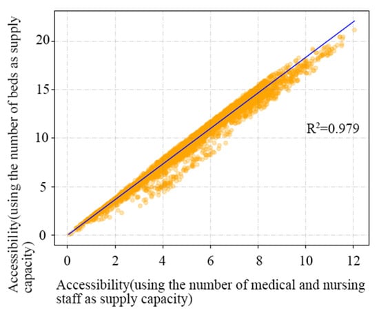 Based on the results of the two accessibility analyses (Figure 7), it can be seen that the results of accessibility in terms of the number of beds and accessibility in terms of medical and nursing staff are highly correlated. The coefficient of determination R2 = 0.979. Therefore, the number of beds was chosen to represent the supply capacity of tertiary hospitals for subsequent calculations.