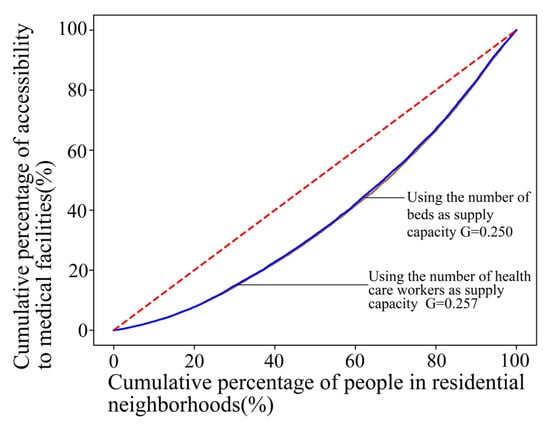 Social equity is considered one of the prominent issues related to social sustainability [], as improving accessibility to healthcare facilities contributes to better social equity []. Many studies have evaluated the equity of public service facilities based on accessibility results [,]. Equity in healthcare facilities means that every resident has the same opportunity to access healthcare facilities [,]. There are three methods of calculating social equity. The first method assesses the distribution of healthcare resources through a holistic approach based on relevant indicators, including the concentration index method [,], the Gini coefficient, and the Lorenz curve. The second approach is to construct an indicator evaluation system, such as an accessibility-based evaluation indicator system []. The third one is the assessment of healthcare facilities through parity [,]. The Lorenz curve and Gini coefficient are commonly used in economics to describe wealth equity. As equity research continues to grow, it is found that the Lorenz curve and Gini coefficient analysis are equally applicable to the fairness measurement of urban public resource allocation. The study uses the first method, the Gini coefficient and the Lorenz curve, for access equity statistics.