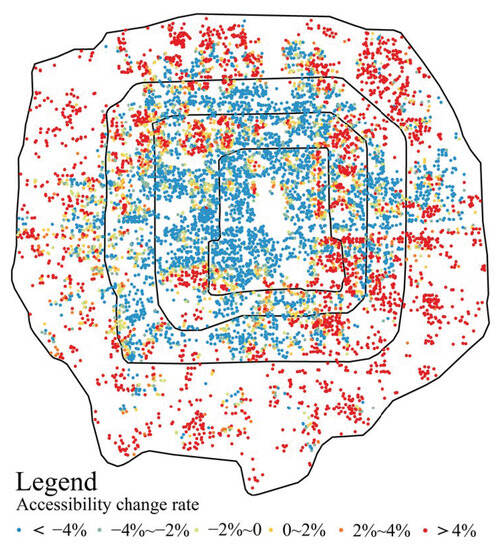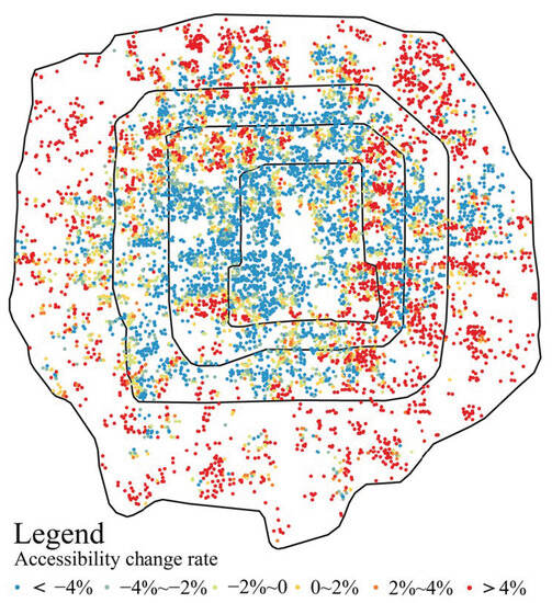 From Figure 9, it can be seen that when in the reduced one-half out-of-vehicle time scenario, the overall rate of change in accessibility between the fifth and fourth rings increases, the accessibility of the central part between the fourth and second rings decreases, the accessibility of the northwest and southeast corners increases, and the overall accessibility performance decreases after the change within the second ring. Figure 10 shows that in the one-third out-of-vehicle time reduction scenario, the change in accessibility is the same as in the one-half out-of-vehicle time reduction scenario. Figure 11 shows that the rate of change in affected apartment complexes is primarily concentrated in “decrease by more than 4%” and “increase by more than 4%”, in which the proportion of apartment complexes with a 4% decrease in the accessibility of tertiary hospitals is 40.27%, while the proportion of apartment complex with a 4% increase in the accessibility of tertiary hospitals is 30.72%. The proportion of apartment complexes with a 4% decrease in the accessibility of tertiary hospitals is 40.27%, while the proportion of apartment complexes with a 4% increase in the accessibility of tertiary hospitals is 30.72%; but in the scenario that reduces out-of-vehicle time by one-third the percentage of “decrease by more than 4%” is 33.65%, which is lower than the one-half out-of-vehicle time reduction scenario. The percentage of “more than 4% improvement” is 27.63%, which is also lower than the one-half reduction in the out-of-vehicle time scenario, and the remaining “reduce by 4% to 2%”, “reduce by 2% to 0”, “ increase by 0 to 2%”, and “increase by 2 to 4%” are all higher than the reduction by one-half of the outside time scenario. The number of apartment complexes with increased accessibility change rates in both scenarios is greater than those with decreased accessibility change rates. In Figure 12, it can be seen that the overall accessibility decreases as the distance from the center increases. Before 9000 m, both scenarios result in lower accessibility than the existing level, and a reduction of one-half of the out-of-vehicle time decreases accessibility more compared to a reduction of one-third of the scenario; after 9000 m, both scenarios result in higher accessibility than the existing level and a reduction of one-half of the out-of-vehicle time increases accessibility more than a reduction of one-third of the scenario. From the results, it can be seen that while reducing transit travel time (including reducing out-of-vehicle time) can improve the convenience of transit travel and the attractiveness of transit modes, simply reducing out-of-vehicle time has different effects on the accessibility of apartment complexes.
