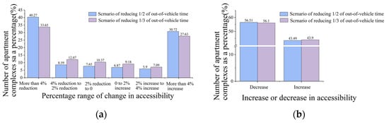 Changes in accessibility under different scenarios: (a) percentage of apartment complexes under different rate of change intervals; (b) increase or decrease in accessibility.
