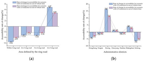Accessibility rate of change in two scenarios: (a) area defined by the ring road; (b) administrative district.