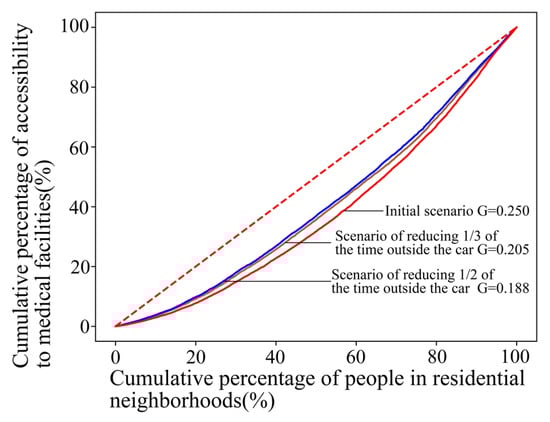 In contrast, both scenarios of reducing out-of-vehicle time increased the equity of accessibility from apartment complexes to tertiary care hospitals, as evidenced by varying degrees of reduction in the Gini coefficient. The Gini coefficient of accessibility from apartment complexes to tertiary hospitals decreases more for the scenario with a one-half reduction in out-of-vehicle time than the status quo, i.e., the reduction in out-of-vehicle time does improve the equity of accessibility of apartment complexes. However, this does not prove that a single decrease in out-of-vehicle time will lead to a sustained increase in equity.