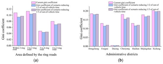 Change in Gini coefficient under different scenarios: (a) area between different ring roads; (b) administrative district.