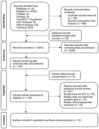 A comprehensive search was conducted across multiple databases, identifying a total of 3253 records for further evaluation. Following removing duplicates and incomplete trial records, 2675 articles were screened by title and abstract, with an additional 32 records identified through recursive search. From this process, 139 studies were selected for full-text reading screening, with an additional five Ph.D. theses retrieved through grey literature searching, yielding 144 studies for full-text review. Upon conducting a thorough full-text reading, 12 studies [40,41,42,43,44,45,46,47,48,49,50,51] were deemed suitable for quantitative meta-analysis after excluding non-RCT literature, studies that did not report reliable data, and studies that did not have outcomes aligned with the study topic. The entire process of literature screening is illustrated in Figure 1.