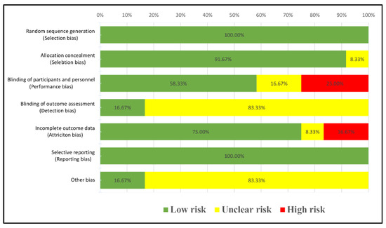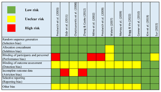 Risk of bias summary for included studies (Green: low risk of bias; yellow: unclear risk of bias; red: high risk of bias) [40,41,42,43,44,45,46,47,48,49,50,51].