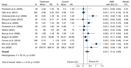 The results of the meta-analysis by pooling 12 studies using a random effects model showed that II intervention groups had a significant increase in PA compared to the control groups (SMD = 0.31, 95% CI: 0.12, 0.50, p < 0.001) (see Figure 4). The effect sizes for individual studies ranged from 0 to 1. The value of I2 showed the presence of moderate heterogeneity. Figure 4 presents the results of the meta-analysis. From the funnel plot (see Figure S1), we can see the asymmetry, but according to the results of the Egger test (p > 0.1), showing that no significant small sample bias event occurred.