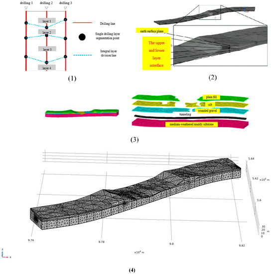 Schematic graph of modeling process: (1) schematic graph of stratum division; (2) result graph of stratum division; (3) stratigraphic division in COMSOL; (4) result of finite element grid division.