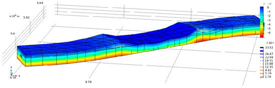The geological model used in numerical simulations has the same dimensions as the actual geological model. Simplifying the computational model is necessary for complex geological conditions. The actual engineering geological conditions are complex and variable, with non-continuous rock and soil layers. Using the actual geological model would increase the computational load while reducing accuracy. The modeling process is shown in Figure 2 and described as follows: (1) Simplify the stratigraphy by retaining the characteristic layers of moderately weathered silty fine sandstone, cobble, silt, and silted fill; (2) Use CAD to convert the plan view into a three-dimensional profile, obtaining the elevation control points of the stratigraphy and filling the missing layers of the borehole profiles; (3) Convert the profiles in 3Dmine software, obtaining a layered geological model by dividing the geological body with the stratigraphic boundaries; (4) Import the three-dimensional geological map into COMSOL software and assign different entity properties to different layers, as shown in Table 1; (5) Mesh and divide the model into a finite number of tetrahedral elements. Due to the limitations of the geological model and computational capacity, an overly detailed model is unnecessary. The final meshing parameters are as follows: a maximum size of 10 m, a minimum size of 0.6 m, a maximum growth rate of adjacent elements of 1.5, a curvature factor of 0.6, and a thin domain resolution of 0.02. The final mesh consists of 510,475 tetrahedral domain elements, 84,114 triangular elements, 8844 boundary elements, and 476 vertex elements;