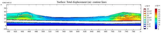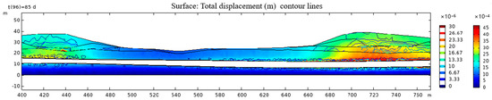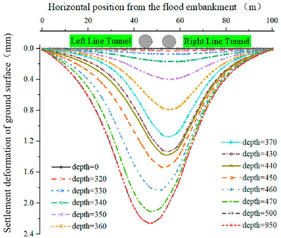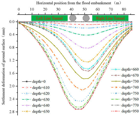As shown in Figure 15 and Figure 16, with the progress of tunnel excavation, when the length of the leading tunnel excavation reaches 320~390 m and 600~670 m, respectively, funnel-shaped settlement begins to occur near the surface of the west bank dike and the east bank dike (no obvious settlement holes appeared before), and the volume of settlement holes gradually expands as the leading tunnel approaches the dike. However, the centers of the settlement holes are all located directly above the leading tunnel. When the leading tunnel cuts through the flood control dike (leading tunnel excavation reaching 390~425 m and 670~715 m, respectively), before the excavation of the trailing tunnel enters the range that affects the flood control dike, the volumes and shapes of the settlement holes no longer change, indicating that surface settlement is temporarily stable. Afterwards, as the trailing tunnel excavation progresses closer, the centers of the settlement holes gradually move from above the leading tunnel, that is, the right tunnel towards the vicinity of the centerline between the two tunnels. Regarding the west bank dike, after the leading tunnel excavation reaches 490 m (trailing tunnel excavation reaches 390 m), there will be no further changes in the lateral deformation settlement holes on the surface of the west bank dike. At this point, the excavation of both the leading and trailing tunnels will no longer affect the lateral deformation of the dike’s surface. As for the east bank dike, after the leading tunnel excavation reaches 770 m (trailing tunnel excavation reaches 670 m), there will be no further changes in the lateral deformation settlement holes on the surface of the east bank dike. At this time, the excavation of both the leading and trailing tunnels will no longer affect the lateral deformation of the dike’s surface.