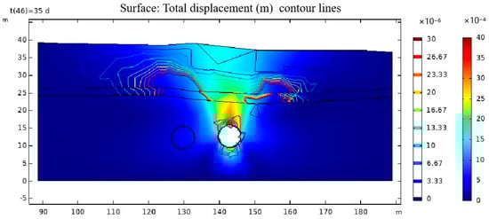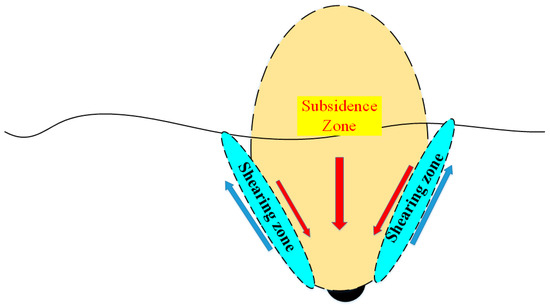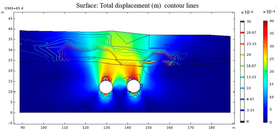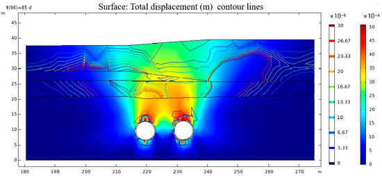When the left-line tunnel is also excavated, the overlapping part of the settlement zones formed by the left-line and the right-line tunnels is located on the left side of the settlement ellipse of the right-line tunnel, as observed from the contours of plastic strain. The expansion is based on the plastic strain zone formed by the right-line tunnel, and the settlement and shear zones are distributed as shown in Figure 13 and Figure 14.