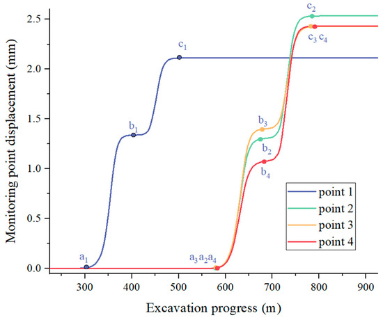 At monitoring point 1, there is no displacement from point 0 to point a. When the excavation of the right tunnel starts, it begins to affect monitoring point 1, causing the displacement to continuously increase. After reaching point b, the right tunnel passes through the embankment, and the displacement tends to level off. Then, due to the influence of the subsequent left tunnel, the displacement continues to increase. Since monitoring point 1 is farther from the left tunnel than from the right tunnel, the second curve is smoother than the first one, and the surface settlement deformation caused by the subsequent tunnel is smaller than that caused by the pre-excavation tunnel. After reaching point c, both tunnels have passed through the west side embankment, and there is no further change in the displacement of the monitoring point. The displacement variation process at monitoring point 2 is similar to that at monitoring point 1, and the increase in displacement caused by the passage of the two tunnels is approximately the same. Because monitoring point 2 is located at the centerline between the two tunnels, its distance from both tunnels is roughly equal, so the impact of the excavation of the two tunnels on it is similar in magnitude. In addition, the curve of monitoring point 3 is relatively shifted backward compared to monitoring point 1 because the direction of tunnel excavation is from west to east, so it passes through the west bank embankment first and then the east bank embankment. Comparatively, during the process of the right tunnel passing through the embank, the displacement slope of monitoring point 4 is large during the passage of the left line tunnel through the embankment, because the monitoring point 4 is far from the leading tunnel, the displacement of monitoring point 4 caused by the passing of the leading tunnel through the embankment is small, and the displacement of monitoring point 4 caused by the subsequent tunnel is large.