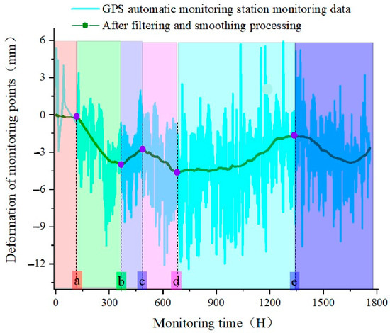 The presence of large-scale machinery conducting surface operations at the construction site, combined with the frequent passage of large vehicles on nearby bridges and roads, as well as the influence of wind, has caused significant fluctuations in the GPS automatic monitoring data. Some points exhibit a high concentration, while others demonstrate a considerable dispersion. In order to address this issue, the debouncing filtering algorithm was implemented to filter the raw monitoring data for four times, removing substantial noise. The remaining points were then subjected to the adjacent averaging method for further smoothing. The monitoring curve of monitoring station 1 after processing is presented in Figure 19. Among them, a, b, c, d, and e respectively indicate the monitoring time corresponding to different stages, and the purple dots correspond to the end time of different stages.