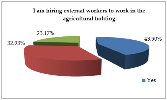 In the sample, the largest percentage of the agricultural producers hired external workers to work on the agricultural holding (43.90%), followed by agricultural producers who did not hire external workers to work in the agricultural holding (32.93%), and the seasonal hire of workers (23.17%), as shown in Figure 3.