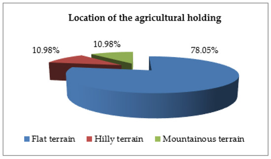 In the sample, the majority of the agricultural producers had agricultural holdings in flat terrain (78.05%), followed by an equal representation of agricultural holdings in hilly terrain and mountainous terrain (both 10.98%), as shown in Figure 4.