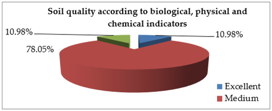 In the sample, the majority of the agricultural producers declared that their soil, according to biological, physical, and chemical indicators, was of medium quality (78.05%), followed by an equal representation of excellent and low-quality soil (both 10.98%), as shown in Figure 6.