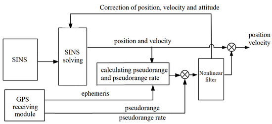 So, it can be found from the above that GPS can effectively address the impact of cumulative errors, while the SINS can compensate for the lack of positioning accuracy when GPS signals are disturbed. Combining two navigation and positioning technologies can increase the precision of navigation and positioning through the technologies enhancing each other’s strengths [3]. The data from the two navigation sources can be fused by the proposed SINS/GPS integrated navigation system, and the fusion approaches can be split into loose coupling and tight coupling, depending on complementarity and scene requirements. The integrated navigation system’s loose coupling is a straightforward design that uses GPS navigation data to repair mistakes made by SINS. GPS and SINS operate separately and without interfering with one another. With long-term work, this cascade structure results in issues of rapid error divergence and weak anti-interference ability [4].