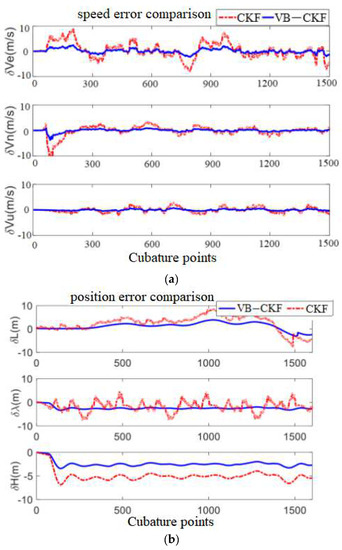 The experiment selects longitude = 106.61, latitude = 29.53°, and altitude = 450 m as the initial position. After setting the initial parameters in the system, in order to verify the adaptability of the algorithm, it is necessary to adjust the measurement noise in the simulation movement of the carrier, especially to make the GPS signal change rapidly with time in a certain period of time, but the specific situation of the change is random. Therefore, combining Equation (14), the tracking ability of the system is enhanced by adjusting the initial weight . In order to ensure that the error of VB–CKF does not increase with time under this condition [32], the number of cubature points is set to 1600, and the initial value of the filter can be set as x0 = [018×1].