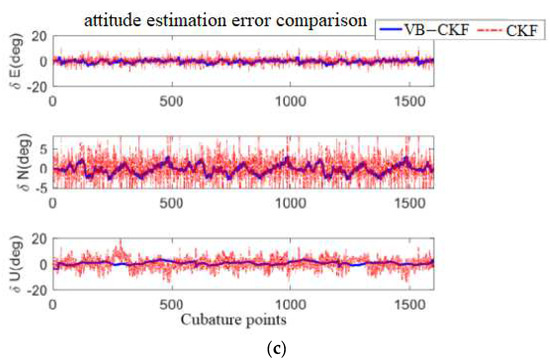 On the whole, the CKF algorithm and VB–CKF algorithm have ideal estimation accuracy of attitude angle, and there is no obvious divergence. However, from the point of view of details, VB–CKF has a better effect, and this algorithm can also produce an obvious response to noise mutation occurring in a short time. Compared to the CKF algorithm, the VB–CKF algorithm weighs various parameters, which makes it more adaptive. The observation results show that the diagonal elements of the time-varying noise variance matrix have the function of independent adjustment and tracking, and the estimation accuracy has been greatly improved. The estimation error of the VB–CKF algorithm is shown in Table 1. Compared with the CKF algorithm, the VB–CKF algorithm improves attitude angle accuracy by around 30% while reducing speed and position estimate error (RMSE) by about 45%.