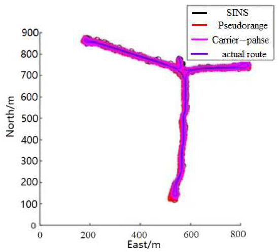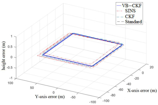The results show that due to the open and flat terrain, the visible number of satellites is high, and the GPS data almost coincide with the standard line. The VB–CKF algorithm filter focuses more on the GPS measurements, and the VB estimator compensates for the SINS noise characteristics, so the combined VB–CKF-based system has optimal positioning results compared to the other two algorithms. When the GPS measurement noise is stable (the number of GPS observables is greater than 4), the sum of the absolute values of the errors of the VB–CKF algorithm in the two-dimensional plane is about 1 m, which is about 10% better than the CKF algorithm in terms of positioning accuracy. In the heading angle comparison, setting the direction pointed by AB as the initial heading 0°, the accuracy of the heading angle of the VB–CKF algorithm is improved by about 20% on average compared with that of the CKF algorithm.