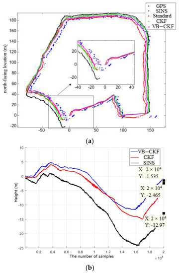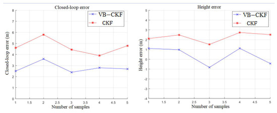 It can be seen from Figure 8 that the CKF algorithm cannot adjust the noise statistical characteristics in real time, and there is a noise jump in the GPS measurement in this test, so that the system gain direction cannot be adjusted in time, resulting in a large closed-loop error of 4.6 m when finally returning to the origin, but the closed-loop error of the VB–CKF algorithm phase is only about 2.5 m. The height difference from the highest point to the lowest point of the CKF algorithm is about 18.9 m, and the final convergence error is about 2.5 m. The difference between the highest point and the lowest point collected by the prototype of the VB–CKF algorithm is about 17.2 m, and the height error after returning to the origin is about 1.5 m. Since the GPS measurement noise in this test environment varies drastically, the CKF is unable to adjust the estimator gain, which leads to a certain degree of deviation, while the prediction of the variance parameters of the VB–CKF algorithm is only determined by the variance parameters of the previous time and the variance variation coefficient of the adjacent time, which realizes the synchronous estimation of the combined system state and the GPS measurement noise variance, so the positioning accuracy of the VB–CKF algorithm is higher.