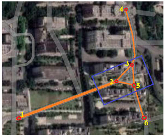 Next, the performance comparison of carrier phase measurement and pseudorange measurement for the VB–CKF algorithm proposed in this study will be experimentally verified. For the first time, the experimental site is chosen in a section with both an empty section and a covered area of tall buildings marked by the blue dashed box. This experiment is divided into three groups, and the pure SINS algorithm, the VB-CKF algorithm of pseudorange measurement, and the VB-CKF algorithm of carrier phase measurement are used as positioning algorithms in turn. The experimenter starts from point 1, completes the route along the number 1-2-3-4-5-6-5-2-1 in Figure 10, and returns to the origin. Figure 10 shows the experimental roadmap, and Figure 11 and Table 3 show the comparison map of the final positioning data.