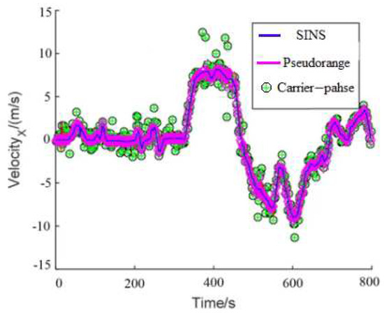In this experiment, the difference between the pseudoranges and pseudorange rate provided by GPS and those calculated by SINS are used as the observed quantities [18]: