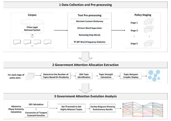 Theoretically, the government’s attention distribution will change with the update of development goals. This study examines the hotspots and evolution rules of government attention in the development of China’s power industry based on the topic evolution model and reveals where the government is focusing its attention on the electric power industry. The specific research framework is shown in Figure 1.