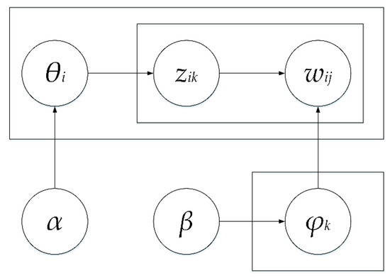 In Figure 2, α denotes the correlation between topics, β is the probability distribution of the topics themselves, both of which are empirically given a priori parameters; denotes the topic distribution of the ith document; denotes the feature word distribution of the kth topic; denotes the kth topic of the ith document; and denotes the jth feature word of the ith document, where and .