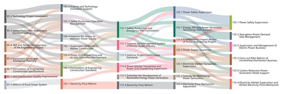 An analysis of the focus of China’s electric power development at different times in Section 4.1 shows that the Chinese government’s attention to electric power development has changed during different periods and produced dynamic changes over time. To examine the government attention’s transmission and diffusion pattern, this study uses the topic evolution approach to find the link between topics based on the similarity of topics in two adjacent stages, analyze the internal factors that change Chinese government’s attention over time, and reform the development of each attention hotspot.