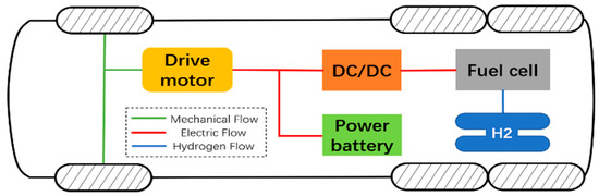 The basic parameters of the fuel cell hybrid electric bus used in this paper are shown in Table 1. The fuel cell system is composed mainly of a proton exchange membrane fuel cell and other accessories, and the vehicle is composed mainly of a fuel cell and a power cell that work together. The structure diagram of this is shown in Figure 1. In this hydrogen fuel cell bus, the fuel cell system boosts its output voltage through a DC/DC converter, and then connects in parallel with the power battery pack. Both the fuel cell system and the power battery system can directly transfer energy to the drive motor. In addition, the two can output energy at the same time to drive the motor with a large output power to drive the vehicle together.